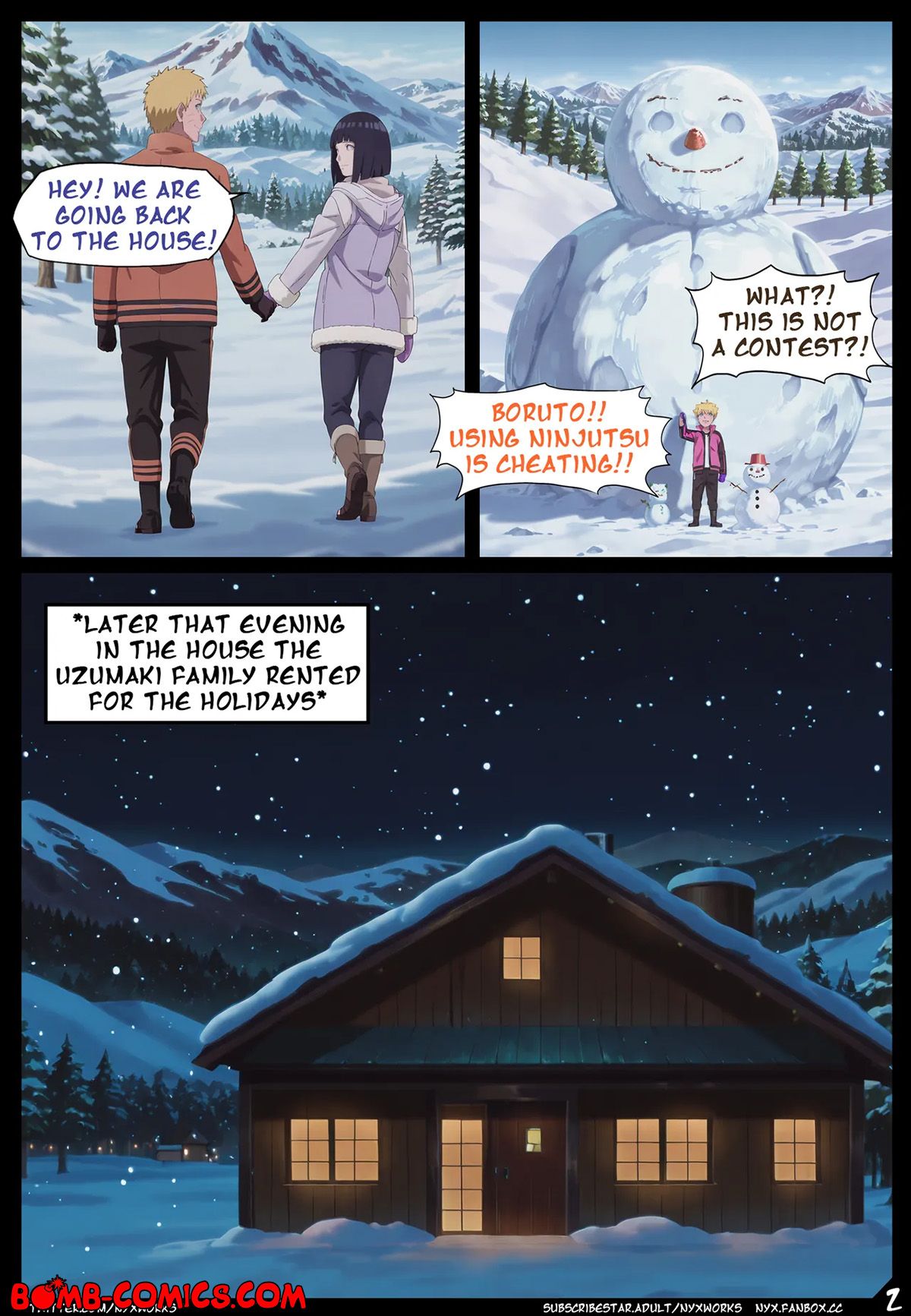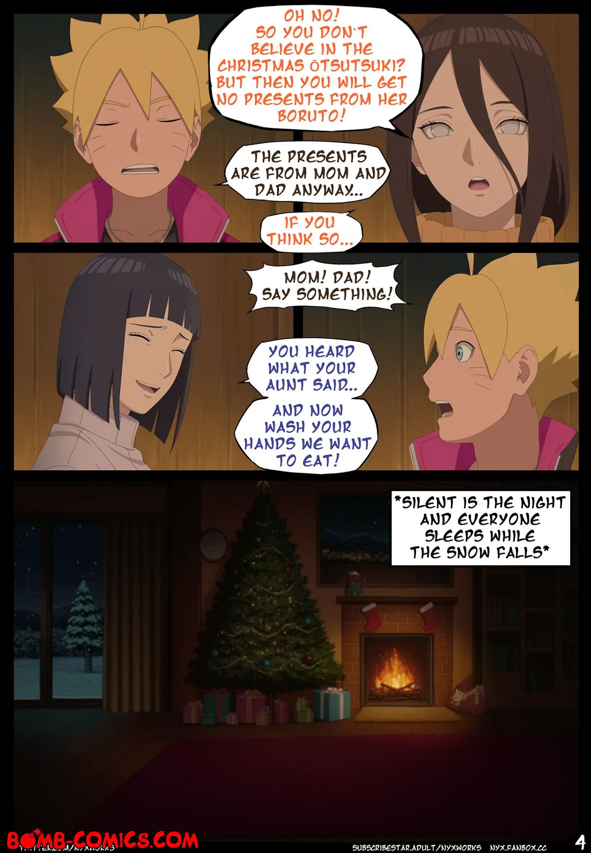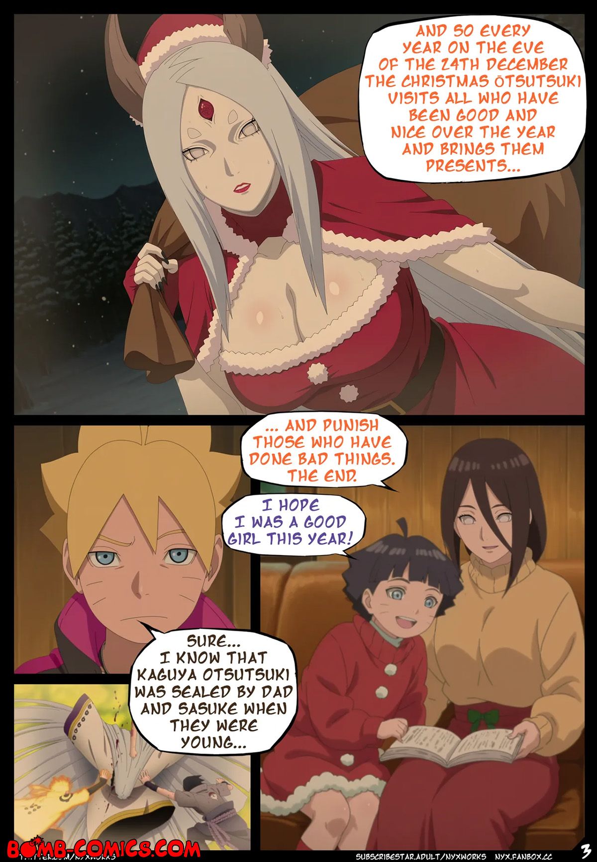 Porn comic Boruto. White Christmas. The Uzumaki family went to a country house for Christmas, where Hanabi told a story about Christmas Otsutsuki and only Boruto did not believe in these horror stories. Imagine his surprise when he met Otsutsuki under the Christmas tree in the middle of the night and now Boruto had to pay for his bad behavior with his big dick…