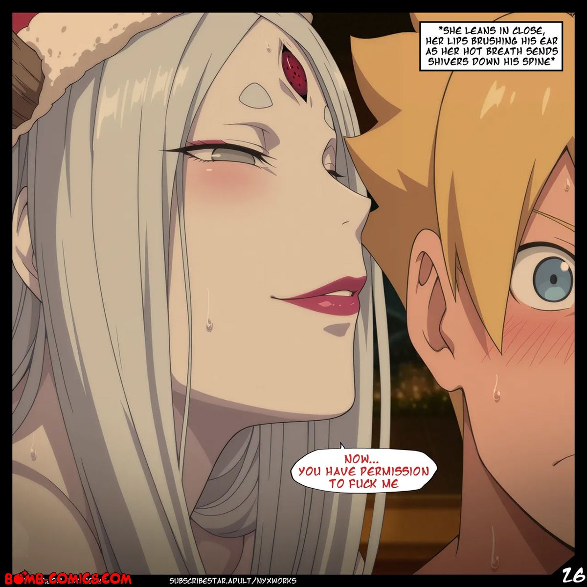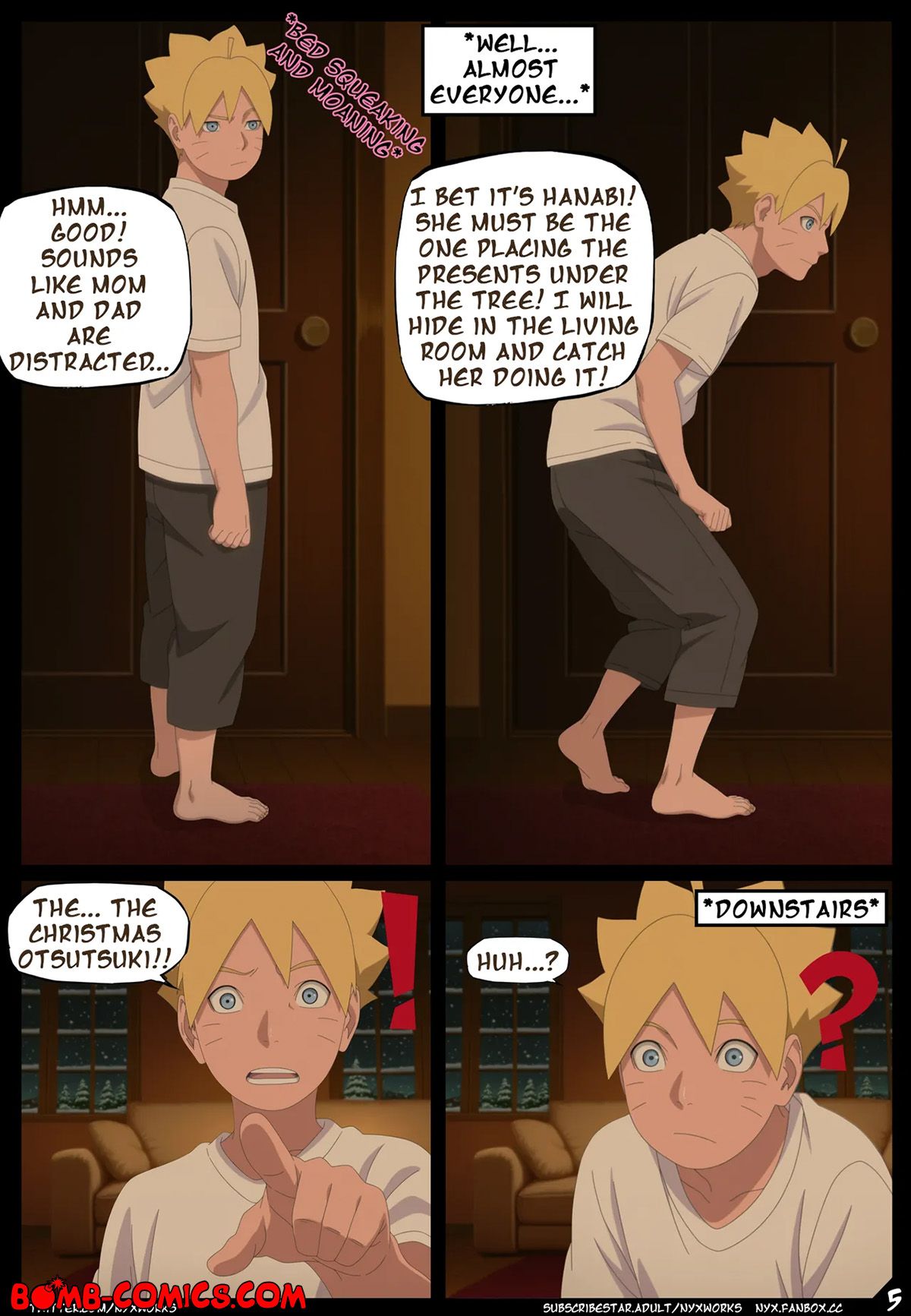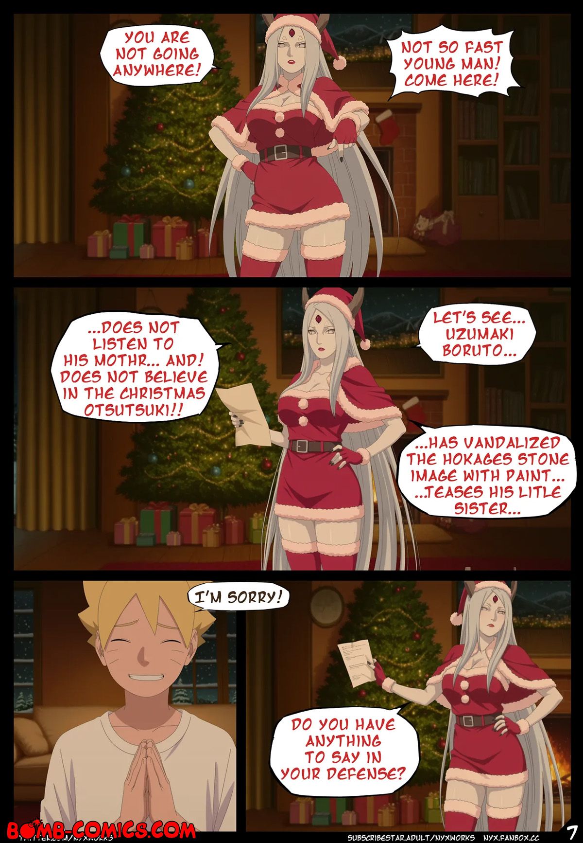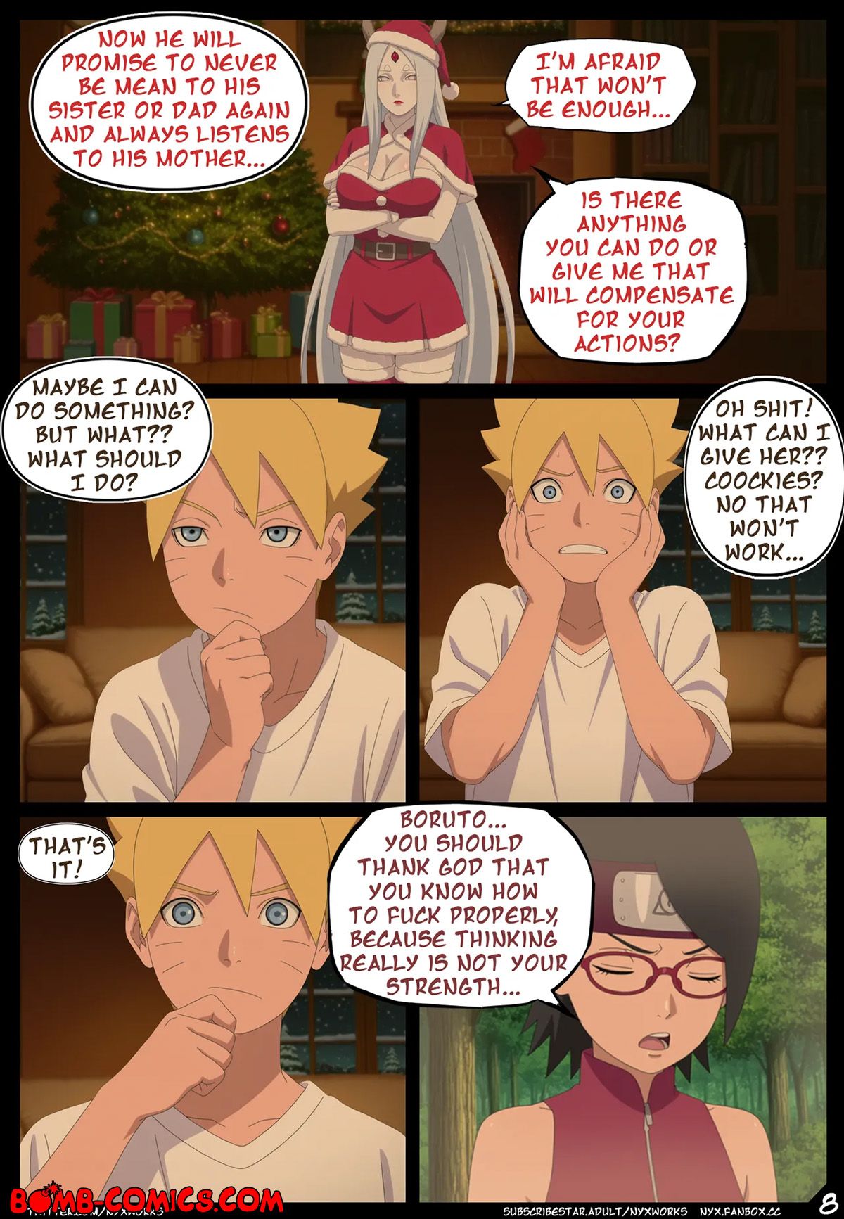 Porn comic Boruto. White Christmas. The Uzumaki family went to a country house for Christmas, where Hanabi told a story about Christmas Otsutsuki and only Boruto did not believe in these horror stories. Imagine his surprise when he met Otsutsuki under the Christmas tree in the middle of the night and now Boruto had to pay for his bad behavior with his big dick…